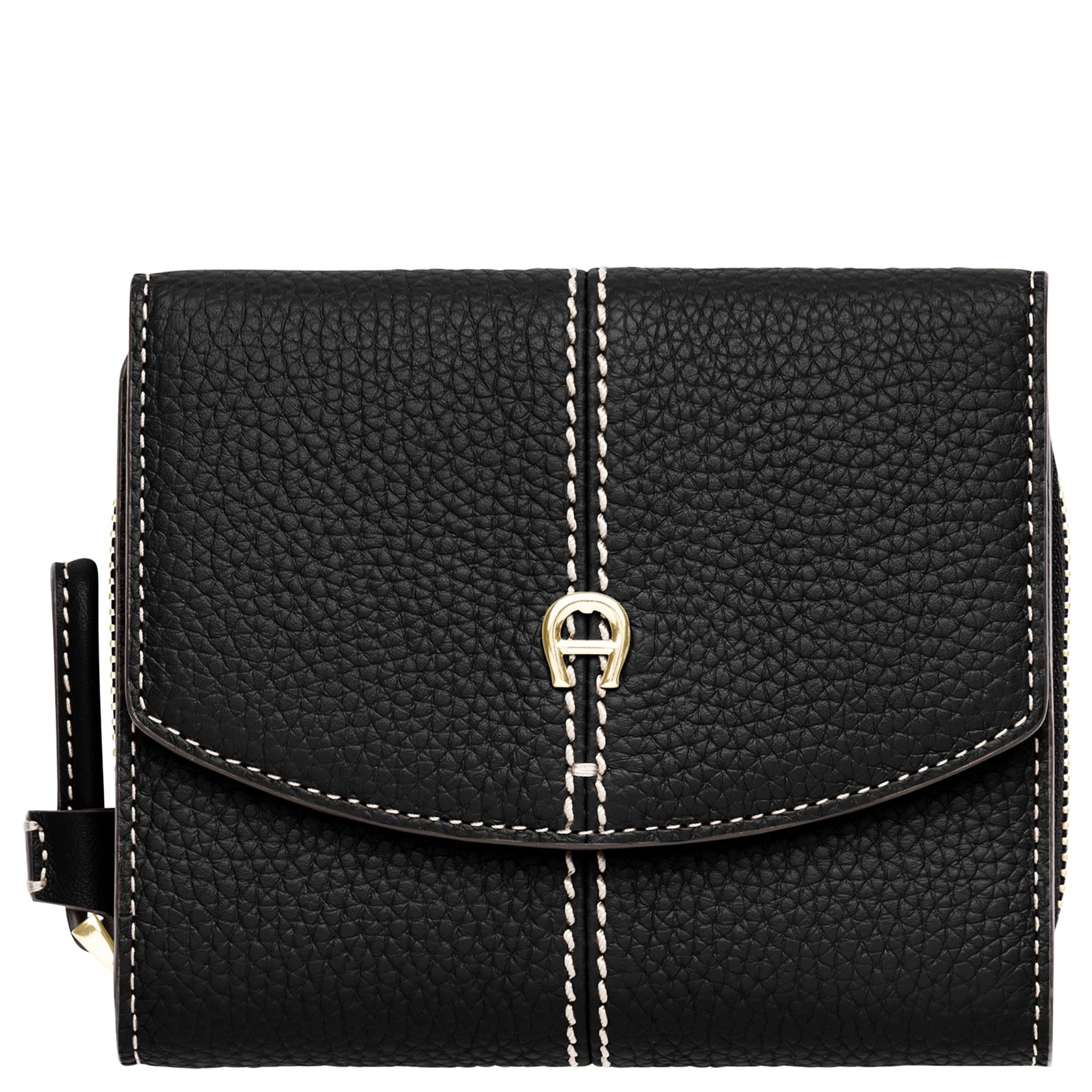 The Aigner Ambra wallet is an elegant leather accessory in classic black, distinguished by its compact size of 12 cm. It offers a clear layout for optimal organization and protects sensitive data thanks to the integrated RFID blocker. The high-quality design is accented by polished gold-colored metal fittings.