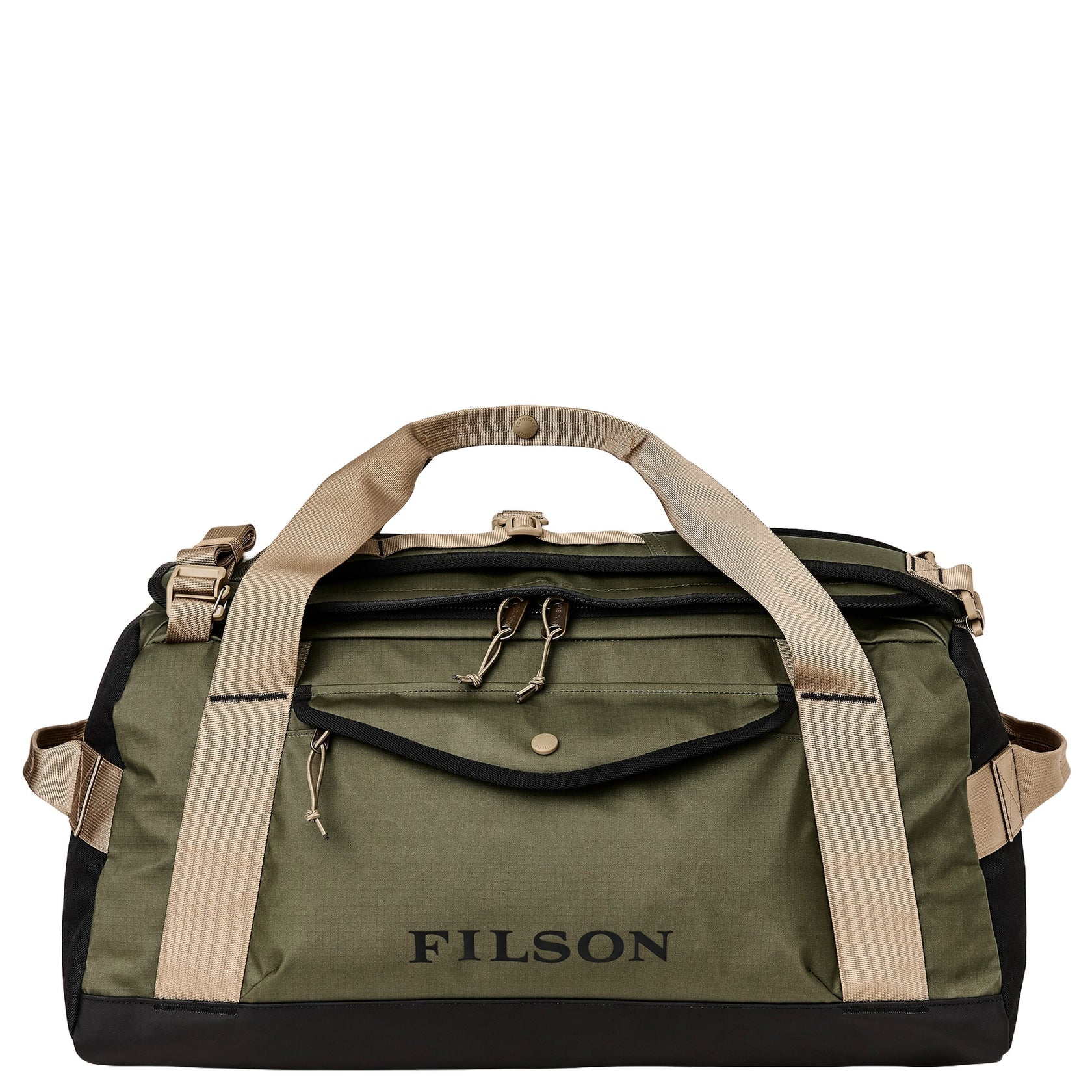 The Filson Scout 50L Duffle is a travel bag with a volume of 50 liters and a height of 58 cm. The material is made of TPU-coated nylon, ensuring excellent water resistance. The bag features a large main compartment with a zipper, allowing easy access and good visibility. Inside, there are practical hanging and mesh pockets, while outside there is a zippered pocket under a flap with a snap button. For carrying, it includes detachable straps, a padded bottom, and a removable shoulder strap.
