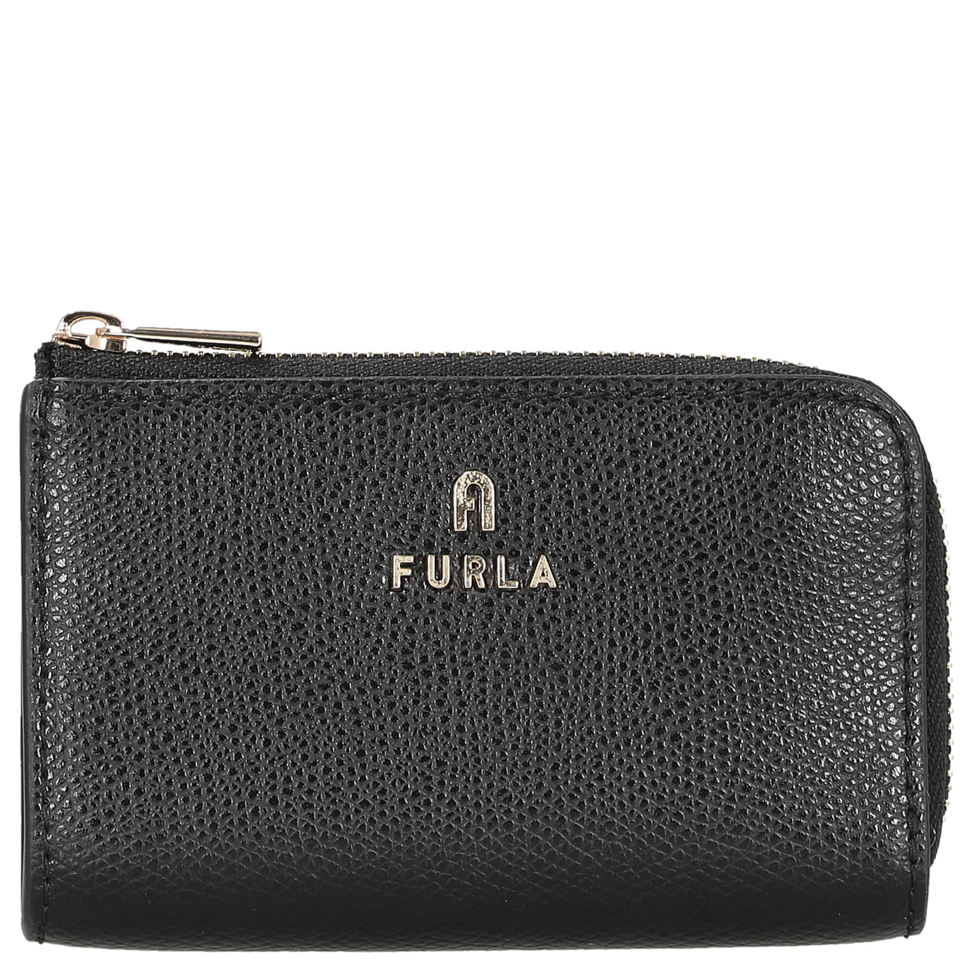 The Furla Camelia key case in elegant nero offers a compact and secure storage solution for keys. The practical case features a spacious main compartment and a sturdy zipper. The subtle metallic Furla logo emphasizes the high-quality appearance.