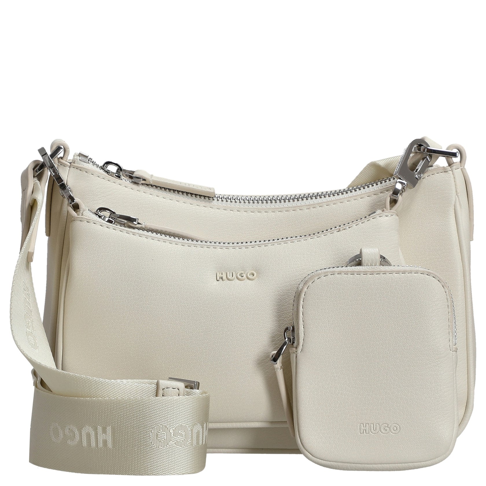 The HUGO Women's Bel 2.0 Crossbody Bag in elegant open white is a stylish must-have for fashion-conscious women who value design and functionality. The high-quality material combines recycled polyurethane with a fine polyester lining, ensuring comfortable wear all day long. The bag impresses with its minimalist, modern design featuring a subtle metal logo embossing that adds a sophisticated touch. The adjustable shoulder strap allows for a personalized fit, making the bag the perfect companion—whether for everyday use or special occasions. With its practical zipper closure and well-organized main compartment, it offers ample space for your essentials and pairs effortlessly with any outfit.