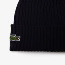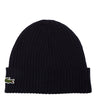 The Lacoste beanie in navy blue is a stylish accessory for chilly days. It impresses with its timeless design featuring a cuff and the distinctive crocodile logo. Thanks to the ribbed wool, the hat provides pleasant warmth and comfort.