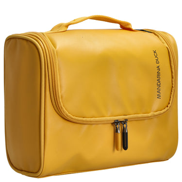 The Mandarina Duck Eco Coated toiletry bag in duck yellow offers an elegant and functional storage solution for travel essentials. The compact model features a practical carrying handle and a secure zipper opening. The prominent logo on the front emphasizes the high-quality brand standard.