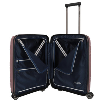 The Travelite Air Base 4-wheel cabin trolley in lilac combines durability and stylish design. Made from resilient polypropylene, it is nearly indestructible and perfect for frequent travelers. The fashionable interplay of rough surfaces and glossy accents makes it a real eye-catcher. With four smooth-running double wheels and a lockable telescopic handle, it offers optimal rolling characteristics. The interior is equipped with high-quality features including elastic packing straps and two packing walls with zippered pockets.