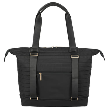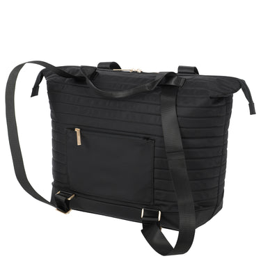 The Travelite BARBARA Stepp 2-in-1 Shopper in elegant black is the perfect companion for fashion-conscious women who value style and functionality. The high-quality, recycled nylon not only gives the shopper a sophisticated appearance but also ensures a comfortable feel. Particularly practical are the adjustable straps, which allow the bag to be quickly transformed into a stylish backpack. Thanks to the clever strap, the shopper can be easily attached to a suitcase—ideal for everyday use or special occasions. The fine metal components add fashionable accents and emphasize the high-quality craftsmanship.