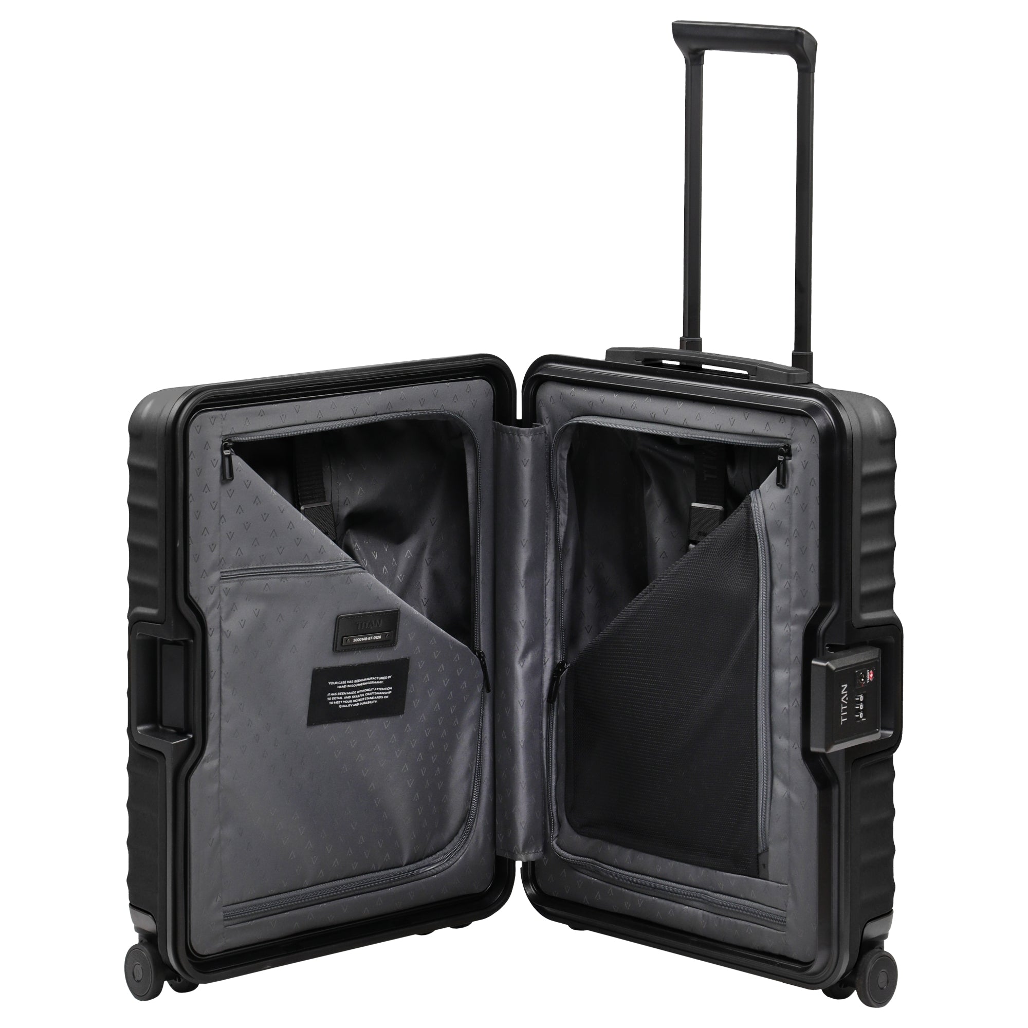 La TITAN OVERSEAS - Maleta de cabina con 4 ruedas S 55/20 cm en nightshade black ha sido diseñada específicamente para ofrecer la máxima seguridad y estabilidad en el equipaje de mano. Con un tamaño compacto de 55 x 40 x 20 cm y un volumen de 38 litros, es ideal para vuelos con casi todas las aerolíneas. El material exterior resistente hecho de 100 % policarbonato garantiza una alta resistencia a los arañazos, mientras que los dos grandes candados TSA y las esquinas reforzadas aumentan la seguridad. Gracias al mono-lock y a las ruedas dobles silenciosas, su manejo es sencillo y cómodo. El interior cuenta con una distribución inteligente con dos divisores, un compartimento de malla y correas de sujeción en forma de Y.