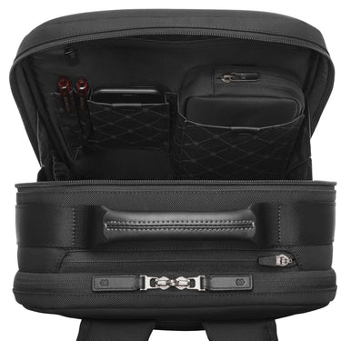 La mochila de negocios Victorinox Mythic Compact en negro es la elección perfecta para los profesionales que valoran la funcionalidad y el confort. Con un compartimento acolchado para laptop, protege laptops de hasta 14 pulgadas de golpes y rasguños, mientras que la distribución interior bien pensada asegura una organización óptima. El diseño ergonómico, que incluye un respaldo acolchado y correas de hombro ajustables, garantiza una gran comodidad al llevarlo. Numerosos compartimentos y cierres ofrecen un acceso rápido a utensilios importantes y objetos de valor.