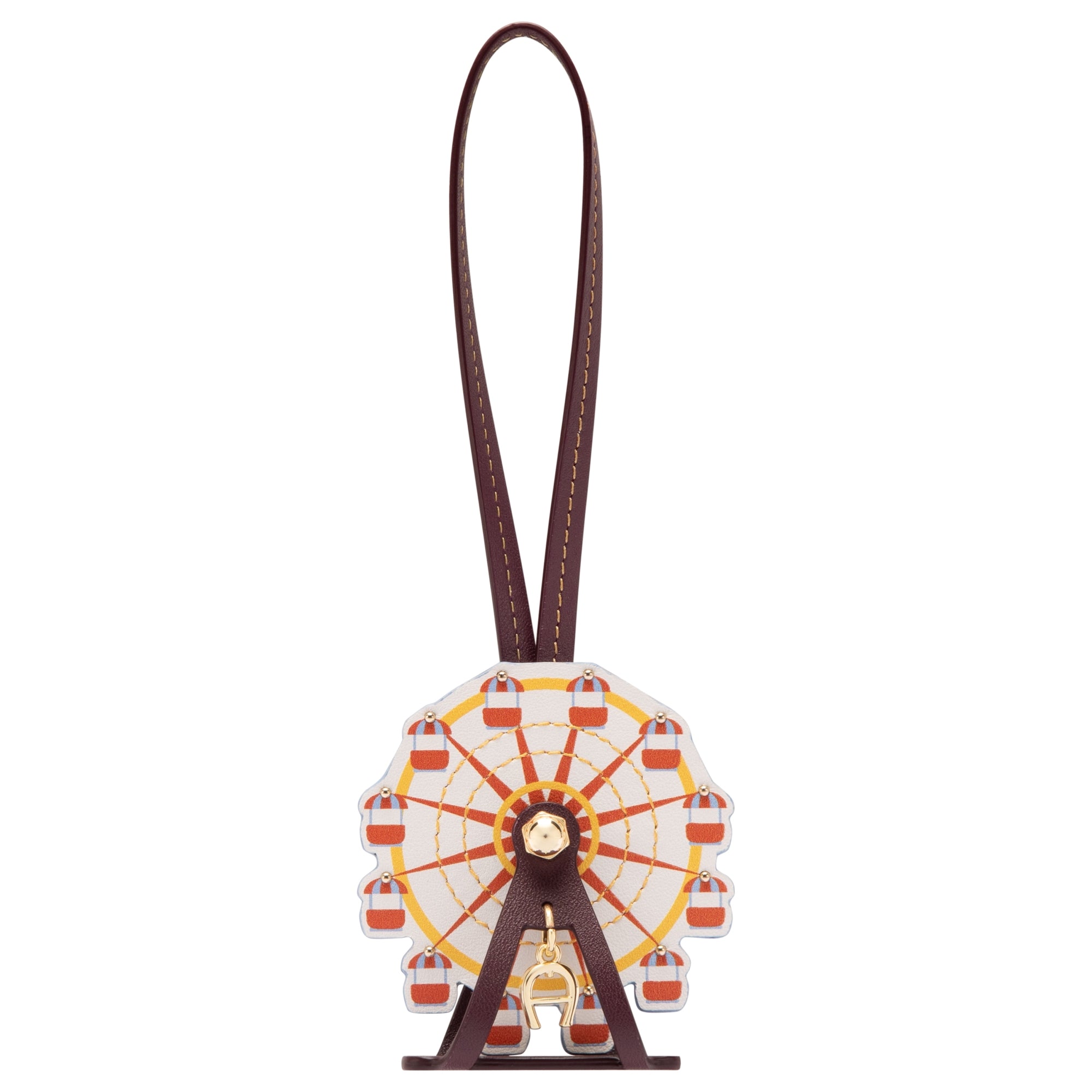 Der Aigner Fashion Riesenrad Anhänger in port red ist ein elegantes Accessoire aus genarbtem Rindsleder. Mit einer Größe von 7 × 7 × 2 cm und einem 15 cm langen Loop eignet er sich ideal zum Befestigen an Taschen oder Gepäck. Die hellgold glänzenden Metallteile setzen feine Akzente und unterstreichen die hochwertige Verarbeitung.