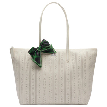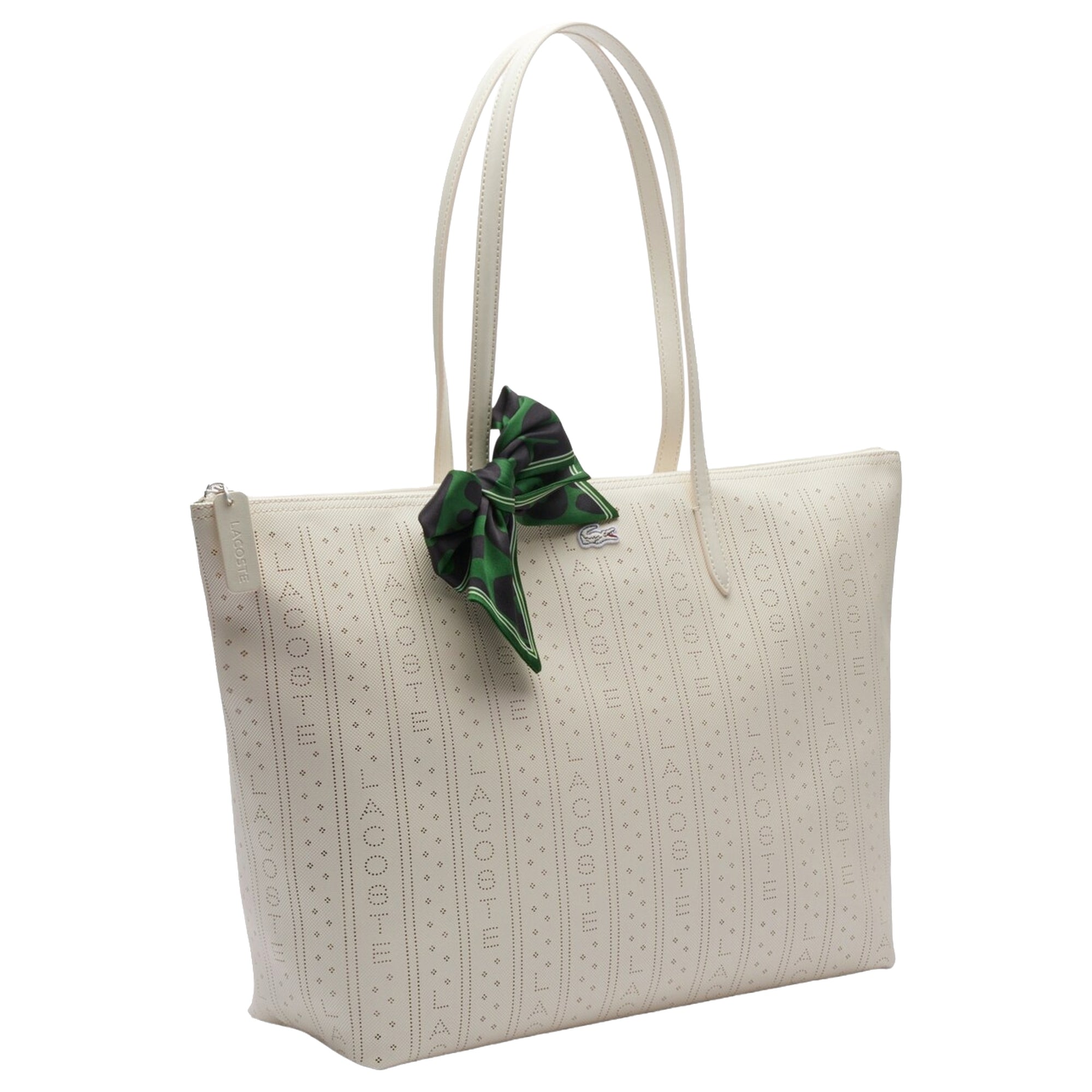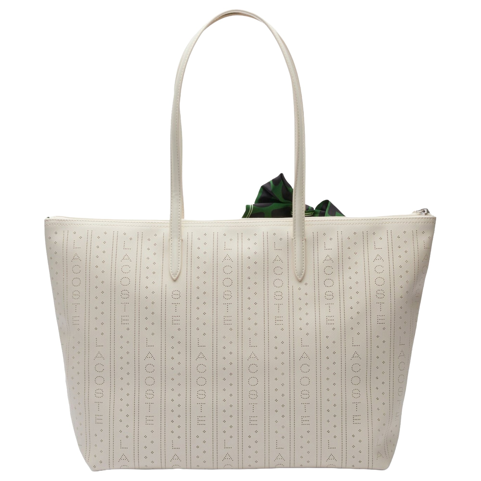 Le Sac Shopping Lacoste Punch se présente dans une teinte claire et élégante avec un motif discret et ajouré de la marque. Ce sac offre un espace de rangement stylé pour le quotidien et séduit par son design minimaliste agrémenté d’un foulard vert vif comme accent mode. Un petit logo distinctif sur le devant complète son apparence haut de gamme.