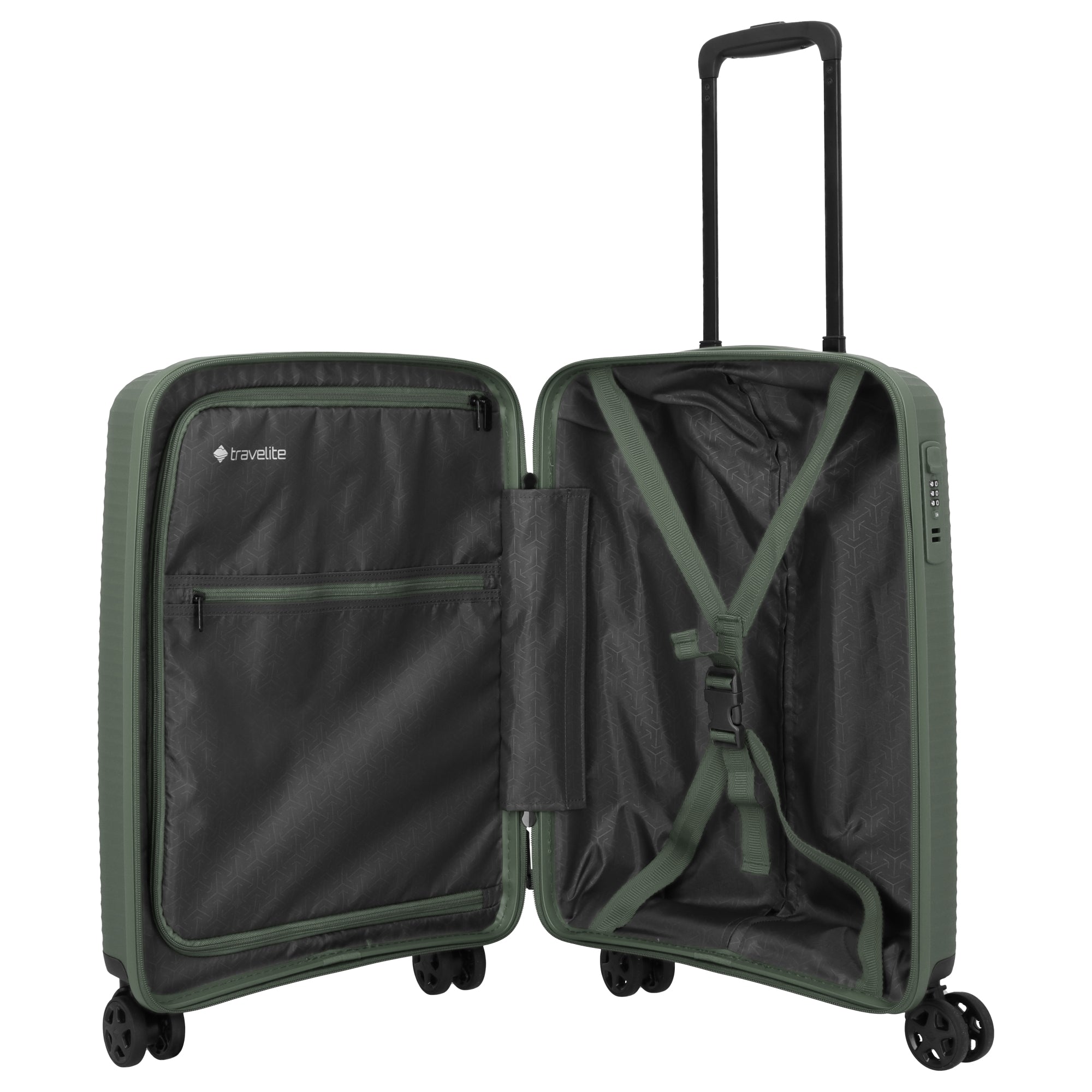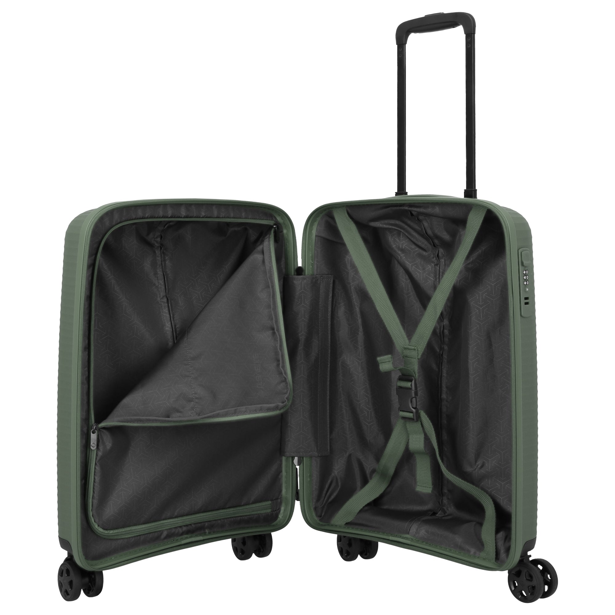 Der Travelite Air Stripe ist ein 4-Rollen-Kabinentrolley in elegantem Grün, der mit seinem leichten und robusten Design ideal für flexibles Reisen geeignet ist. Das stabile Polypropylengehäuse bietet zuverlässigen Schutz, während der Trolley durch seine leisen Doppelrollen und den verstellbaren Teleskopgriff komfortabel zu handhaben ist. Mit praktischen Packwänden und Gurten im Innenraum sorgt er für optimale Organisation.