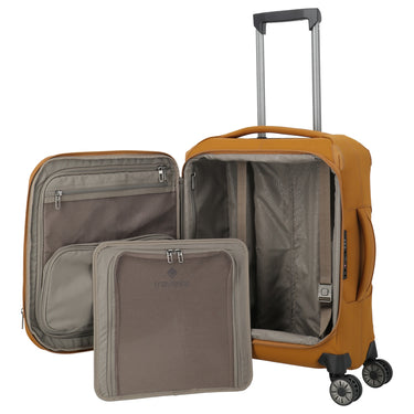Le Travelite Priima trolley cabine à 4 roulettes taille S en couleur curry se distingue par sa construction en fibre de verre robuste, garantissant une grande stabilité et durabilité. Avec une hauteur de 55 cm, il offre un espace intérieur spacieux pouvant être étendu jusqu'à un volume de 34 litres. Le trolley est équipé d'une poignée télescopique extensible ainsi que de quatre doubles roulettes souples pour une maniabilité aisée. À l'intérieur, plusieurs compartiments zippés, une cloison et une plaque de rangement amovible assurent une organisation optimale. De plus, le trolley est doté d'une serrure TSA et d'un support pratique pour trolley.
