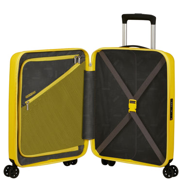 Der American Tourister Selection Rejoy ist ein leichtgewichtiger 4-Rollen-Kabinentrolley in electric yellow, der sich perfekt für Handgepäck eignet. Mit den Maßen 55 x 40 x 20 cm bietet er ein Volumen von 35 Litern und ein Gewicht von nur 2,4 kg. Die Hartschale aus 100% Polypropylen sorgt für eine robuste und langlebige Qualität, während das integrierte TSA-Schloss für zusätzliche Sicherheit sorgt. Das Innere ist mit einem Bodenfach mit Kreuz-Packriemen und einem oberem Fach mit Netztrennwand ausgestattet, um das Packen zu erleichtern. Das Design wird durch einen Tragegriff an der Oberseite und eine ausziehbare Teleskopstange ergänzt, um den Transport komfortabel zu gestalten.