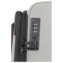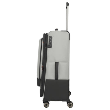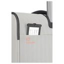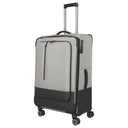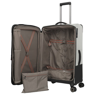 Der Travelite Crosslite 4-Rollen-Trolley L in der Farbe natur besteht aus recyceltem PET und bietet eine nachhaltige Materialwahl. Mit einer Höhe von 77 cm und einem erweiterbaren Volumen von bis zu 88 Litern eignet sich der Trolley für längere Reisen. Der geräumige Innenraum ist mit Packgurten, einem Wäschefach und drei herausnehmbaren Taschen ausgestattet. Für den sicheren Transport sorgen ein TSA-Schloss, ein verstellbares Teleskopgestänge sowie vier leichtgängige Doppelrollen. Zusätzliche praktische Details sind das Adress-Schild, Trage- und Bodengriffe sowie ein Kantenschutz.