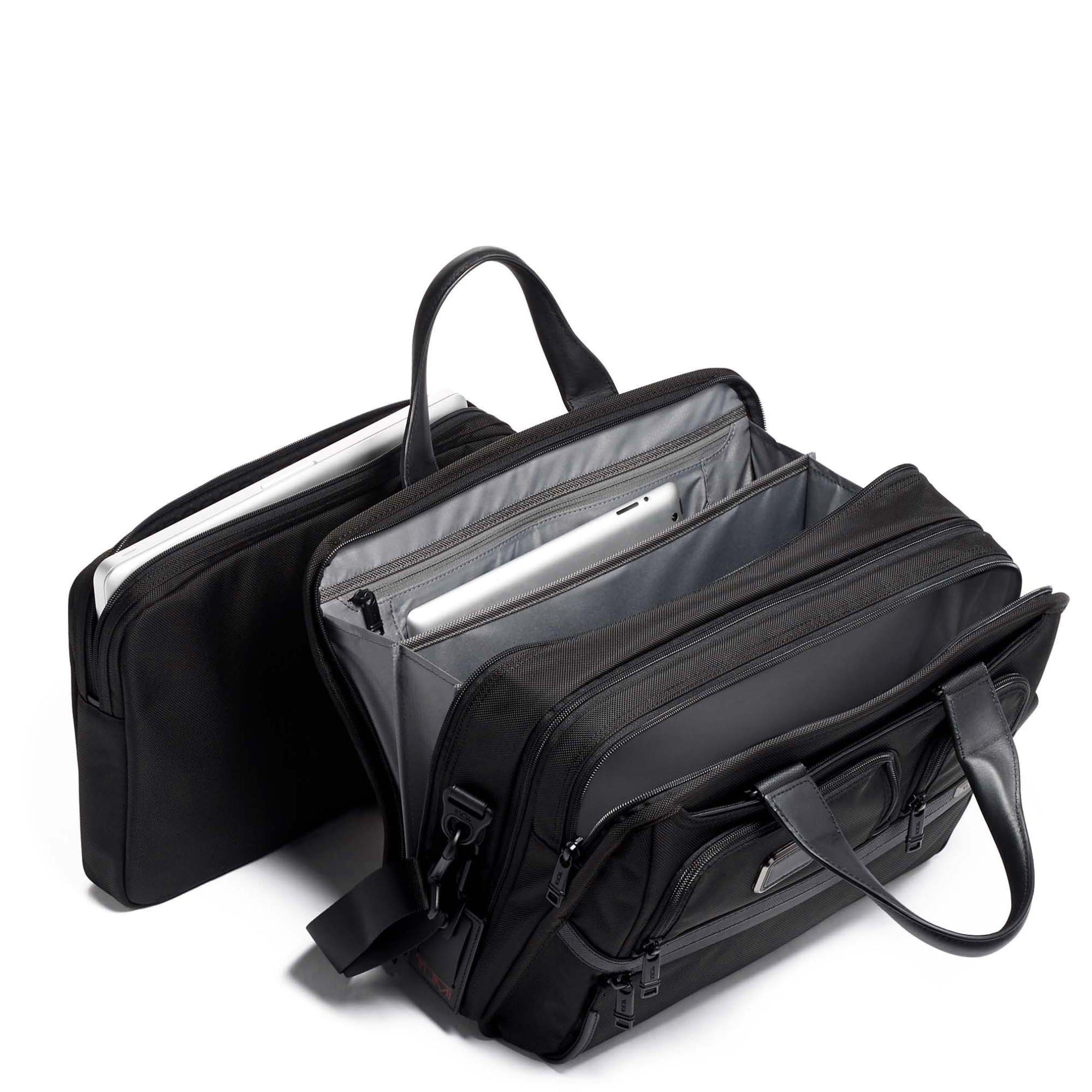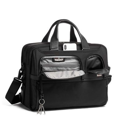 Die TUMI Alpha - Laptop-Aktentasche verbindet robuste Verarbeitung mit hoher Funktionalität. Das ballistische FXT®-Nylon sorgt für außergewöhnliche Langlebigkeit und Schutz, während das geräumige Hauptfach mit Reißverschlusserweiterung Flexibilität bietet. Dank der herausnehmbaren Laptophülle und vielfältigen Organisationsfächern ist die Tasche ideal für den professionellen Alltag geeignet. Die eleganten Tragegriffe aus Leder und der abnehmbare Schultergurt gewährleisten hohen Komfort. Die Tasche ist mit praktischen Features wie Add-a-Bag Schlaufe und TUMI Tracer® ausgestattet, um Ihre Organisation zu optimieren.